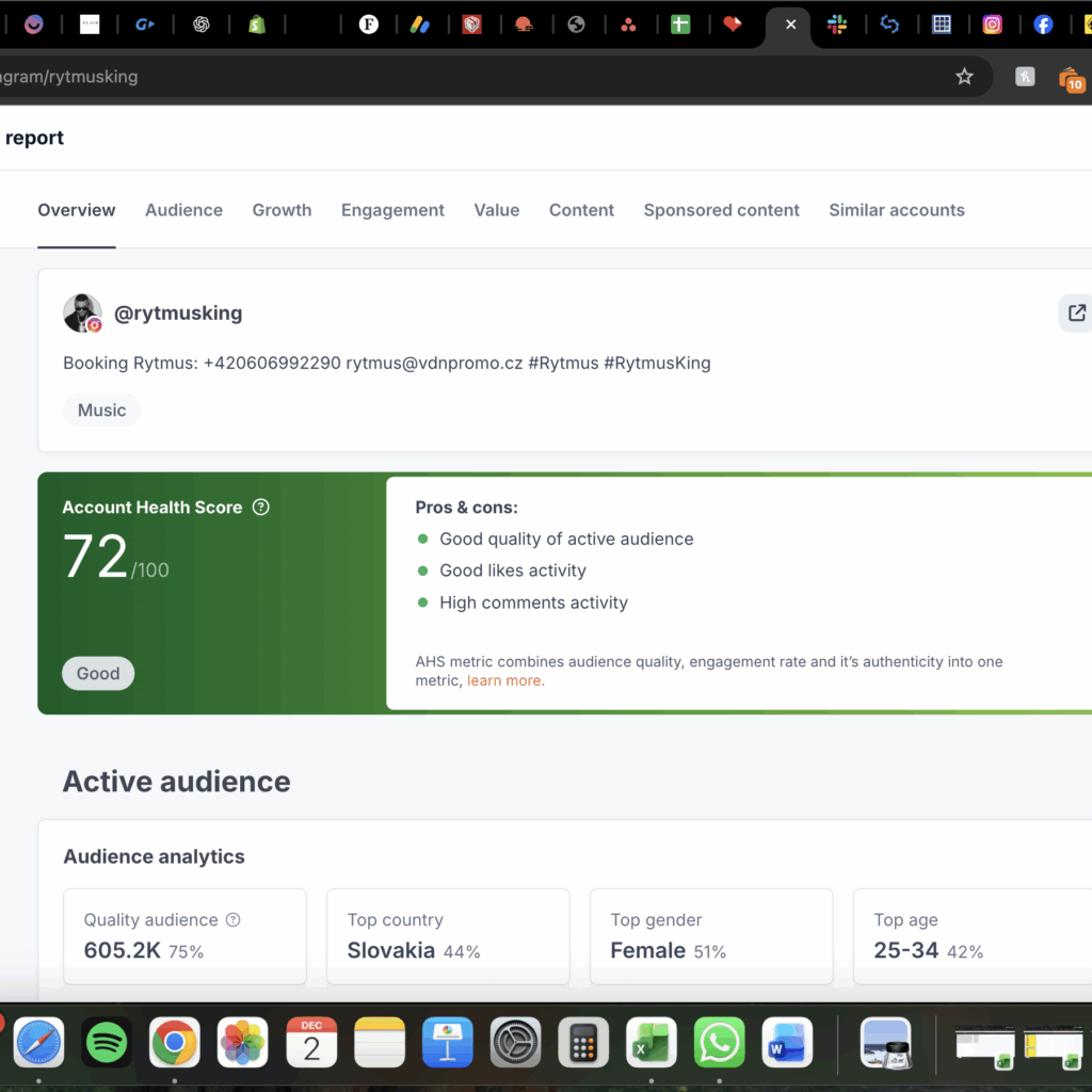 HypeAuditor pri každom profile vytvára komplexný röntgen účtu, ktorý kombinuje kvalitu publika, výkon obsahu aj mieru autenticity. Report, ktorý si poskytla, je ukážkový – obsahuje všetky zásadné parametre, ktoré značky potrebujú pri posudzovaní influencera. Nižšie nájdete vysvetlenie jednotlivých sekcií presne podľa poradia v reporte. Využili sme v reporte rapera Patrika Vrbovského, @rytmusking, a na jeho reporte vám vysvetlíme položku po položke.