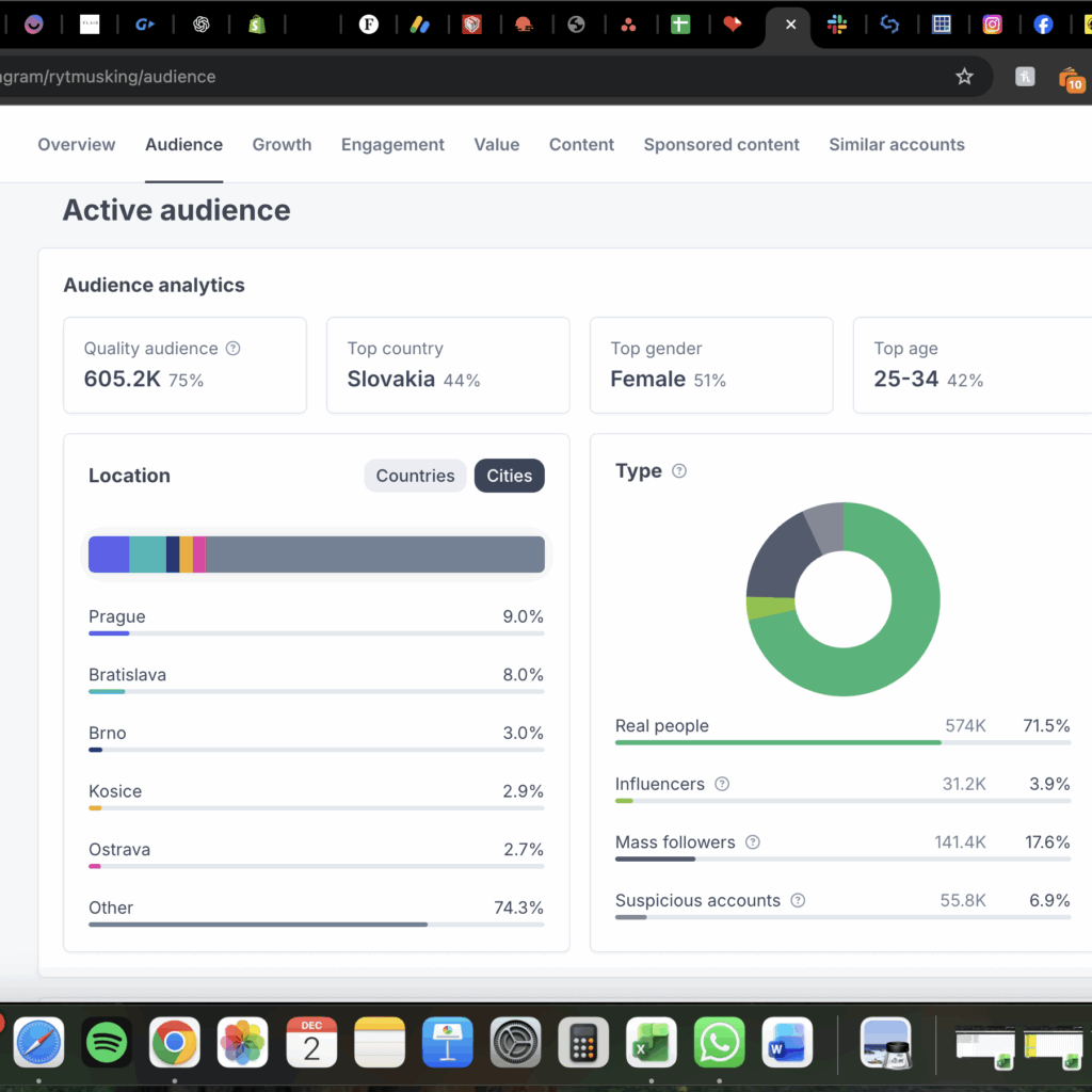 Zobrazuje rozloženie publika podľa krajín a miest. V reporte vidíme, že Slovensko má 43.9%, Česko 28.4% a menší podiel USA, UK a Nemecko. V rámci miest Praha 9%, Bratislava 8%, zvyšok Brno, Košice, Ostrava a iné sú roztrúsené mestá, obce, dediny s menším zastúpením. To nám ukazuje, že ide o regionálne silný profil, nie globálny profil s náhodnými followermi.