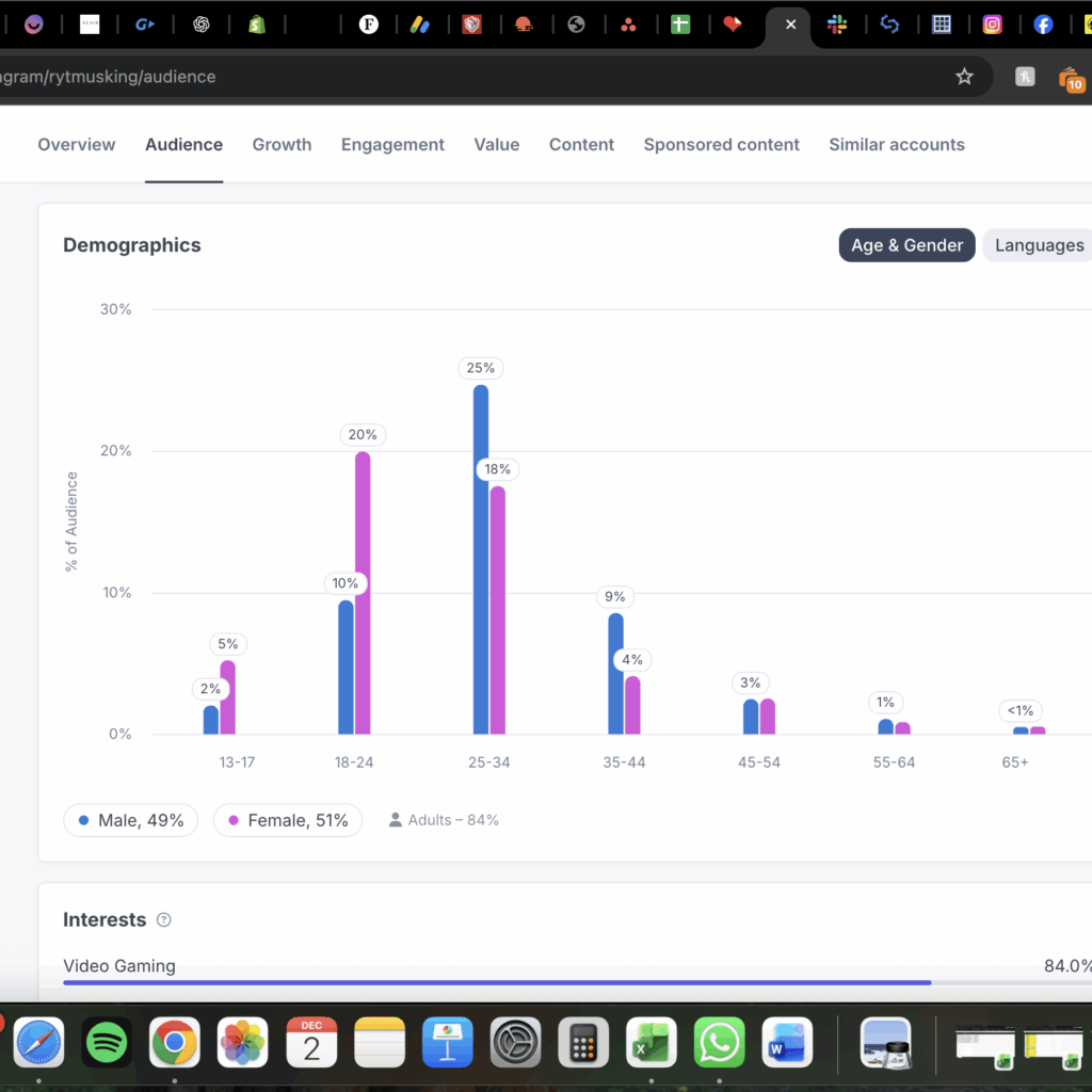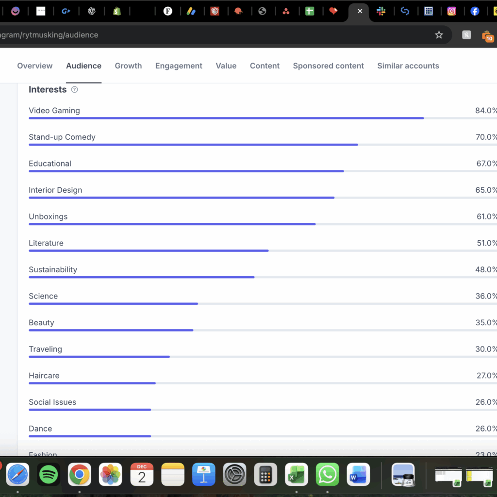HypeAuditor analyzuje, o čo sa publikum zaujíma. Najväčšie záujmy v reporte: video gaming (84%), stand-up comedy (70%), educational obsah (67%), interior Design (65%), inboxings (61 %), literature (51 %). Toto pomáha značkám posúdiť, aké typy spoluprác by na účte rezonovali najviac.