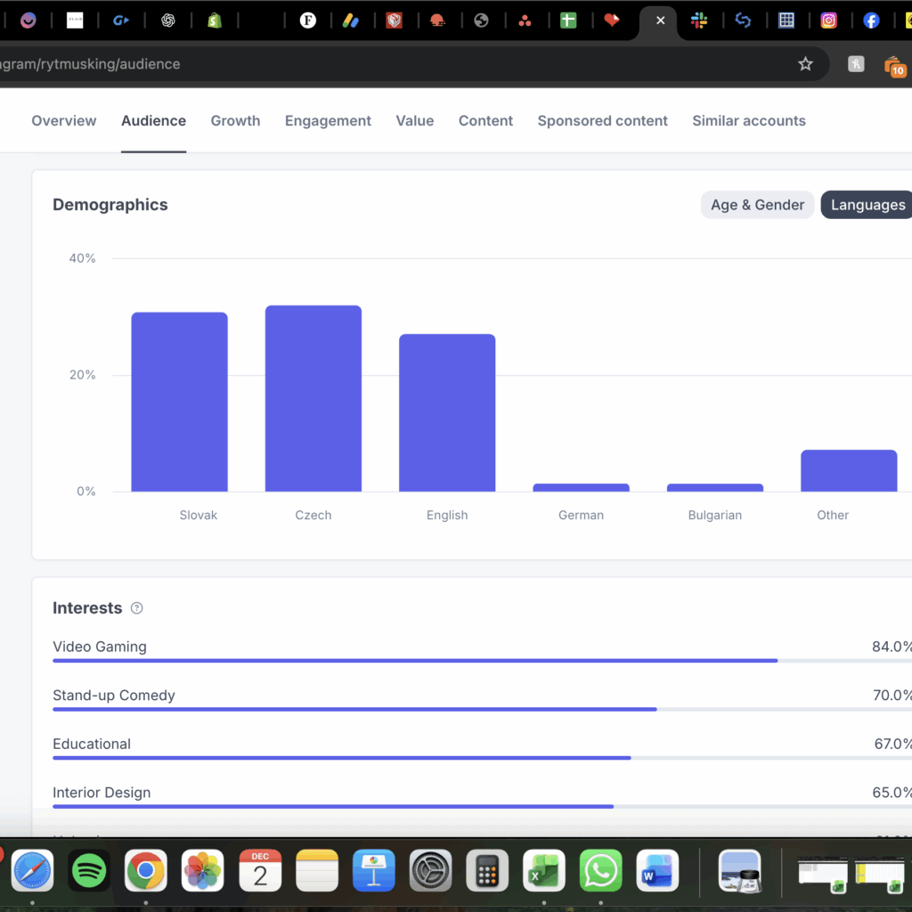 Najviac zastúpené: Slovak, Czech, English. To potvrdzuje regionálnu relevanciu účtu.