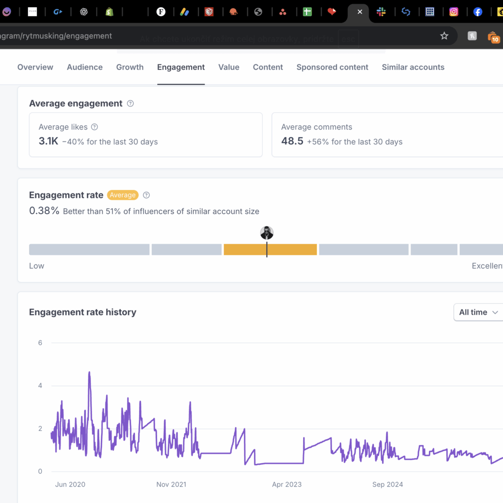 Toto je kľúčové číslo. HypeAuditor tu porovnáva influencerov s podobnou veľkosťou účtu. Hodnota 0.38% je presne priemer kategórie.