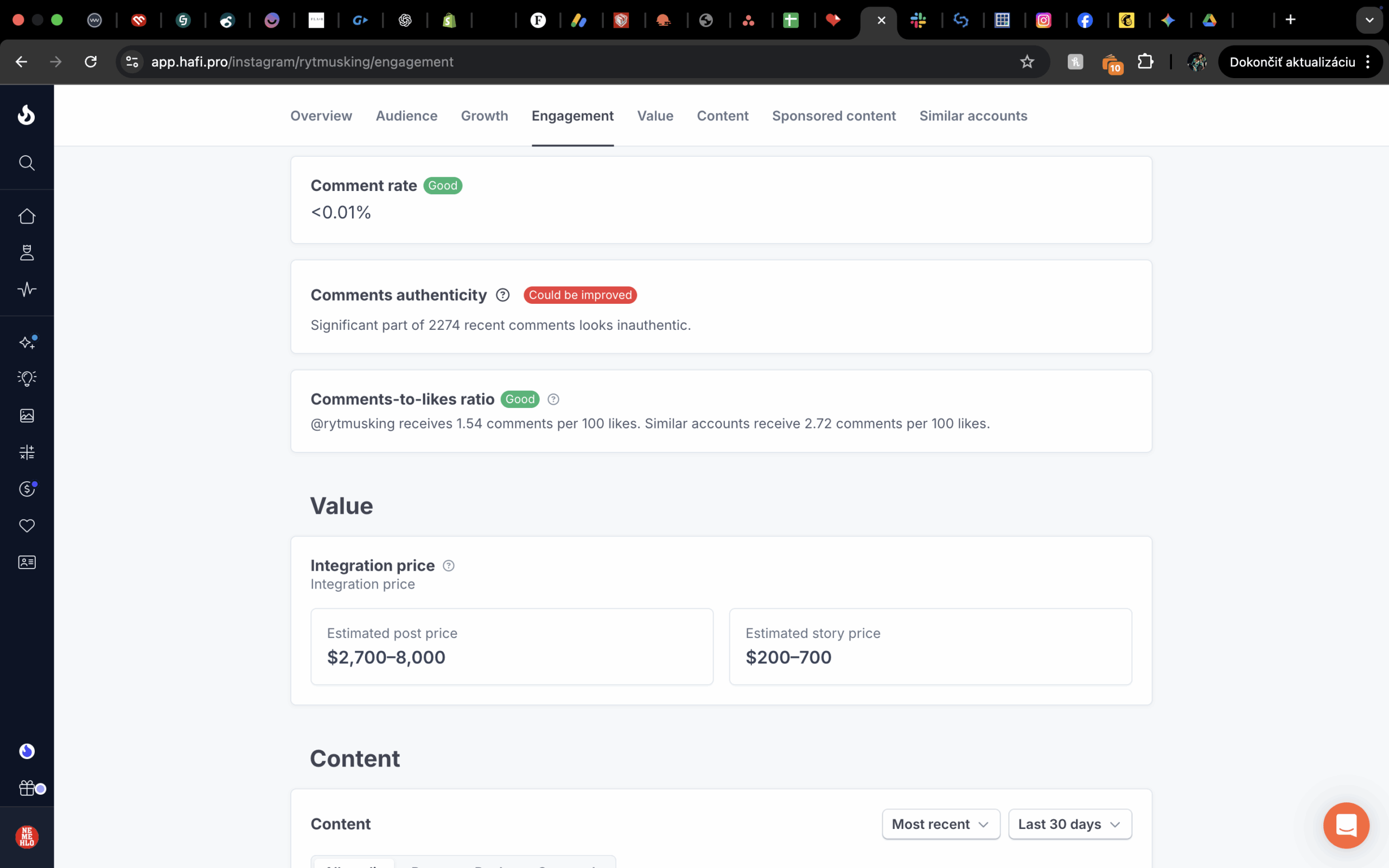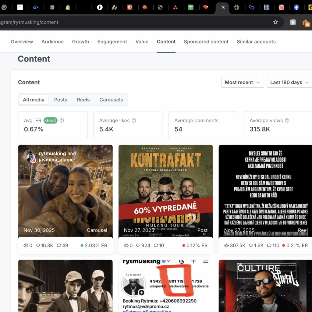 HypeAuditor vyhodnocuje: aké formáty influencer používa (reels, posts, carousels), ich výkonnosť, priemerné hodnoty interakcií.