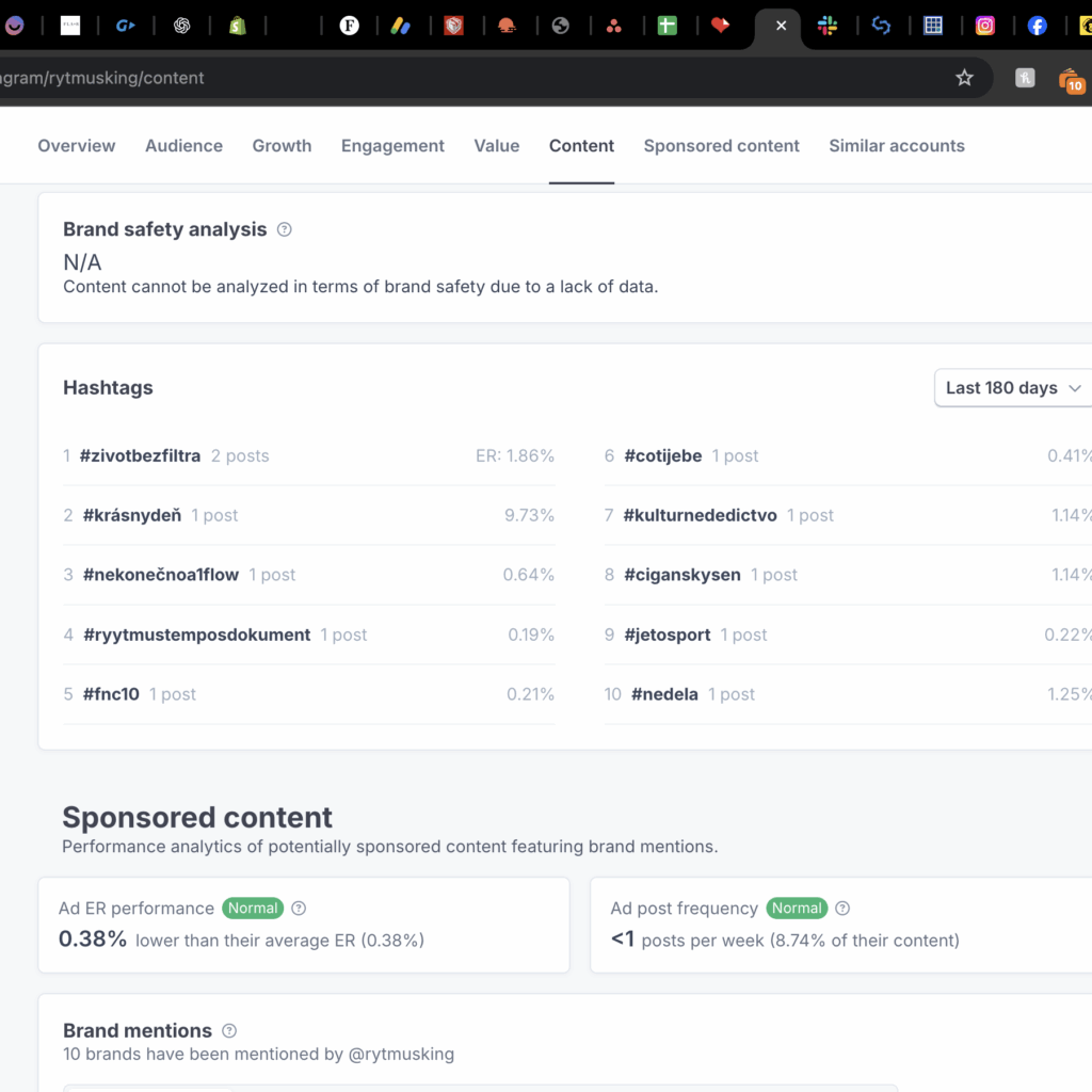Zobrazuje najpoužívanejšie hashtagy, ich výkon a zoznam značiek, ktoré influencer spomenul. Značky si vedia rýchlo overiť či influencer robí reklamy, ako často, ako úspešné sú.