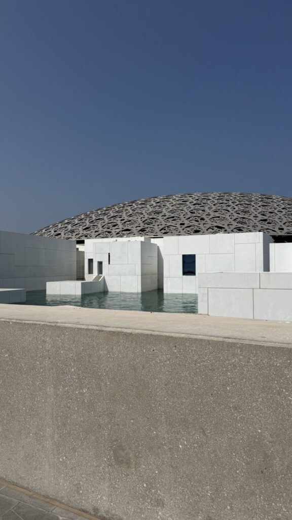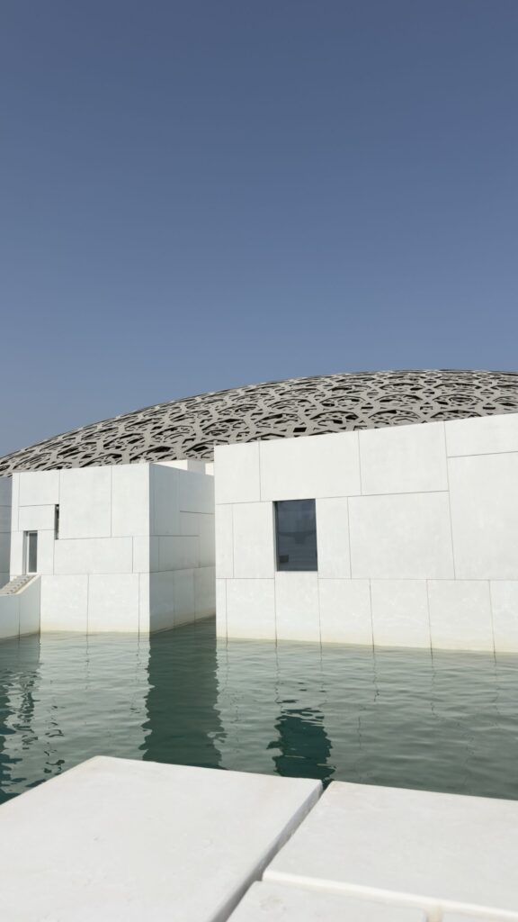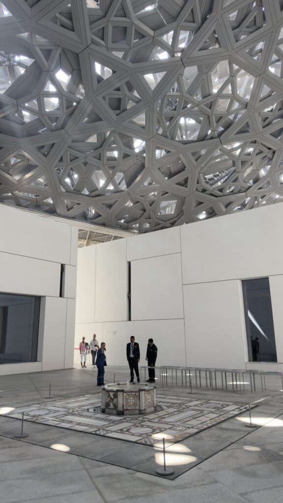 Kupola váži približne 7 500 ton, no vznáša sa nad návštevníkmi s ľahkosťou, akoby bola len vzdušným závojom. Múzeum sa rozkladá na ostrove Saadiyat, len pár minút od centra Abu Dhabi, a keď sa k nemu približujete, pôsobí, akoby plávalo na vode – presne podľa zámeru architekta.
