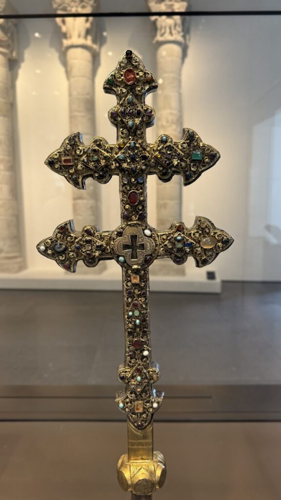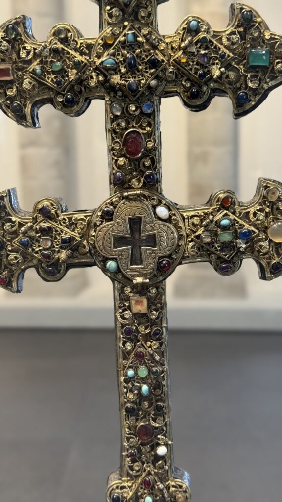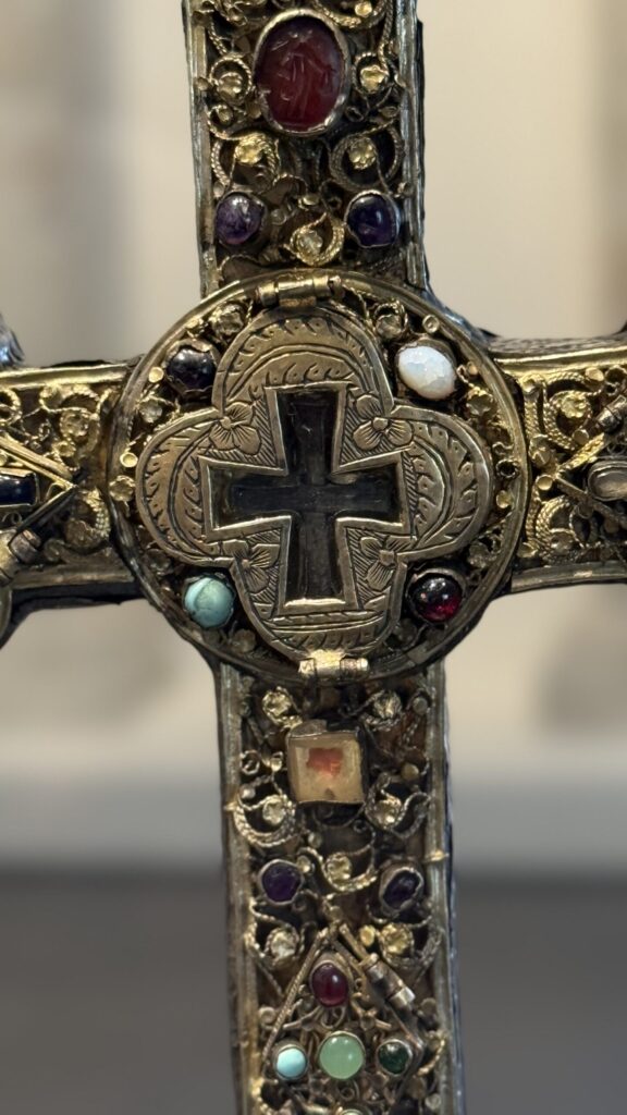 Relikviár v tvare kríža, ukrývajúci úlomok Pravého kríža, predstavuje fascinujúce spojenie viery, histórie a umeleckého remesla. V strede relikviára sa nachádza malý, no mimoriadne vzácny fragment – úlomok Pravého kríža, na ktorom bol podľa kresťanskej viery ukrižovaný Ježiš Kristus. Tento fragment je viditeľný cez sklenené okienko, lemované precíznou zlatníckou výzdobou a osadené polodrahokamami. Relikviár z francúzskeho Limousinu nie je len umeleckým dielom gotického majstrovstva, ale je tiež hmatateľným symbolom stredovekej viery, ktorá v drobných relikviách hľadala spojenie s Božským. Každý detail tejto krížovej schránky odkazuje na úctu, s akou stredoveký človek pristupoval k posvätnému – k tajomstvu, ktoré chcel mať doslova na dosah ruky.